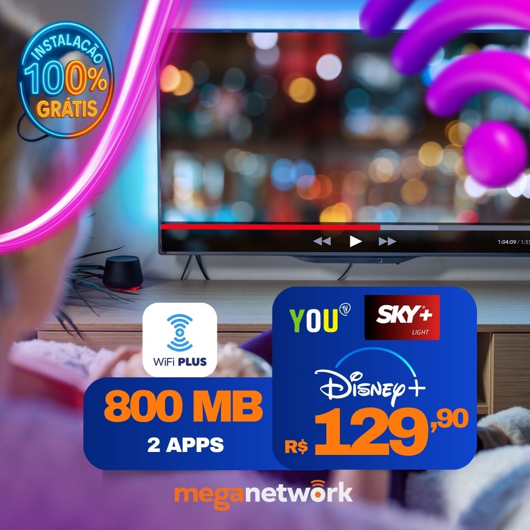 800 Mega + WiFi 5G + YOU + Sky+ + Disney+. Velocidade alta com entretenimento incluso.